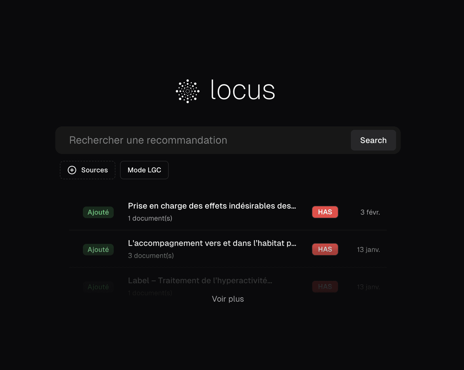 HAS, sociétés savantes, bases médicamenteuses — chacune publie à son rythme, dans sa logique. Locus les structure en un seul lieu.